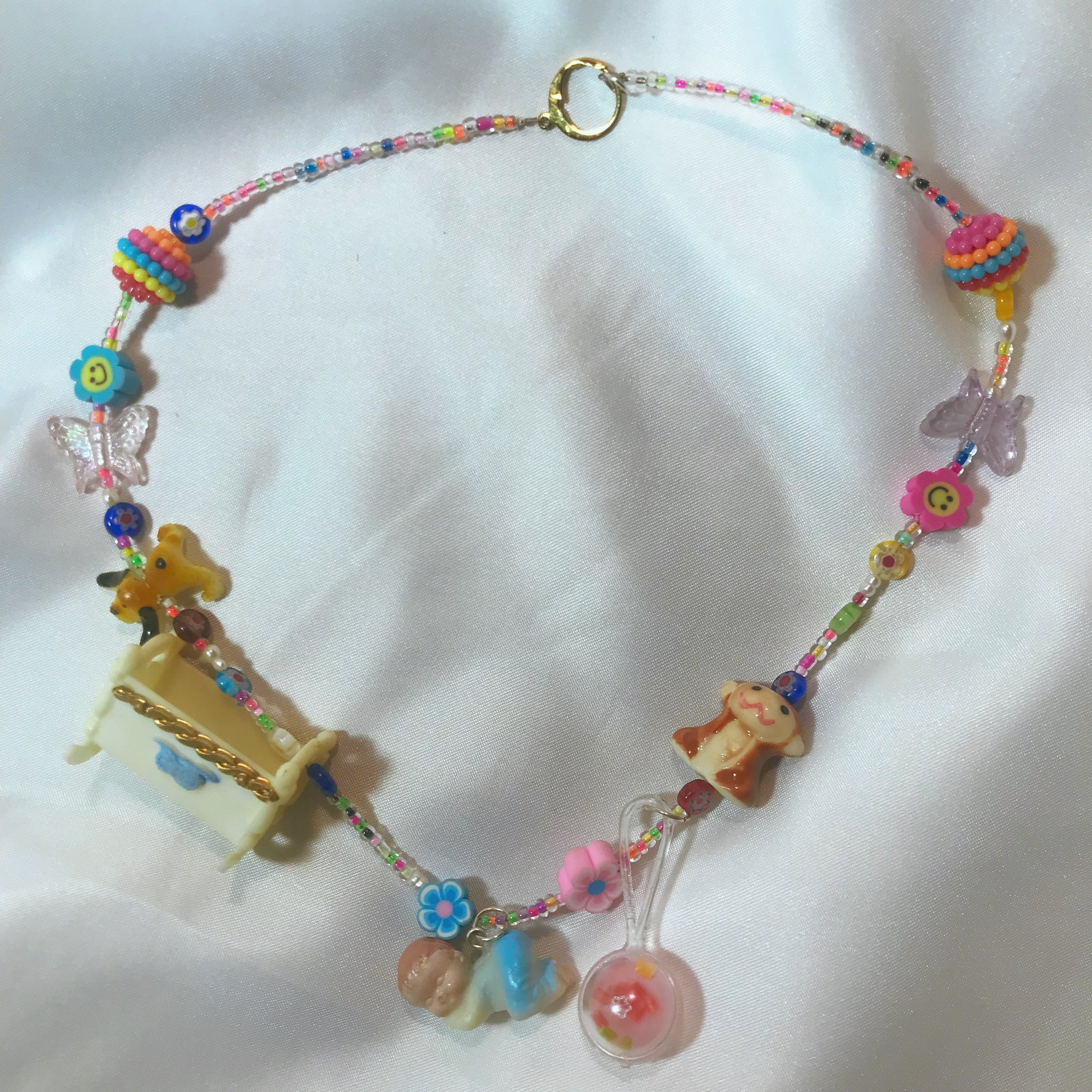 The baby, puppy, and crib beads were ripped off of a proverbial tacky art project that someone created and then donated to Goodwill. This "upcycled" necklace is definitely one of a kind, and you are instantly 1000% more cuter while wearing it.