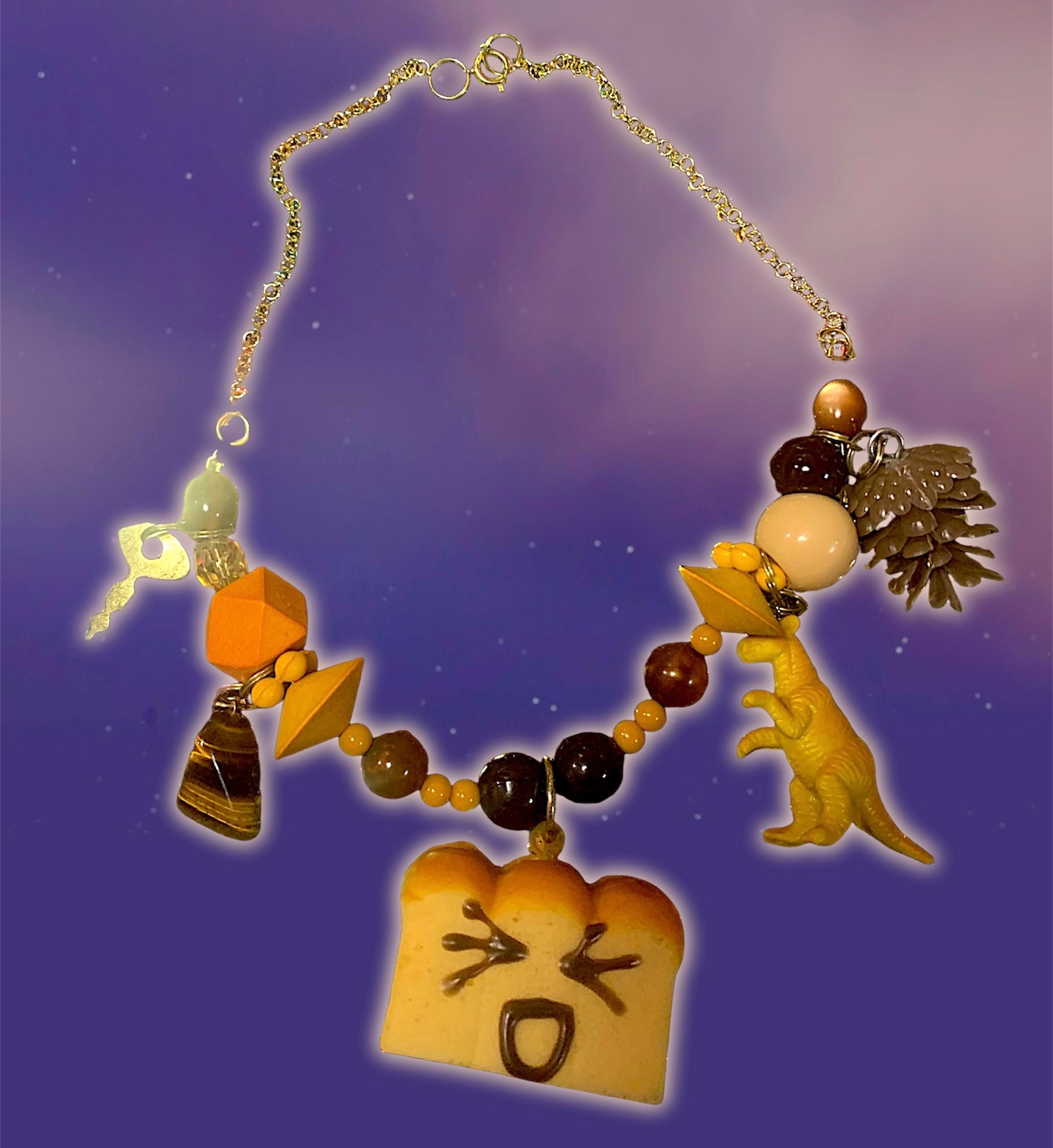 featuring a squishy bread charm! with dino and tigers eye, a pinecone and a key?! perhaps this combination may unlock a new dimension of randum never b4 seen