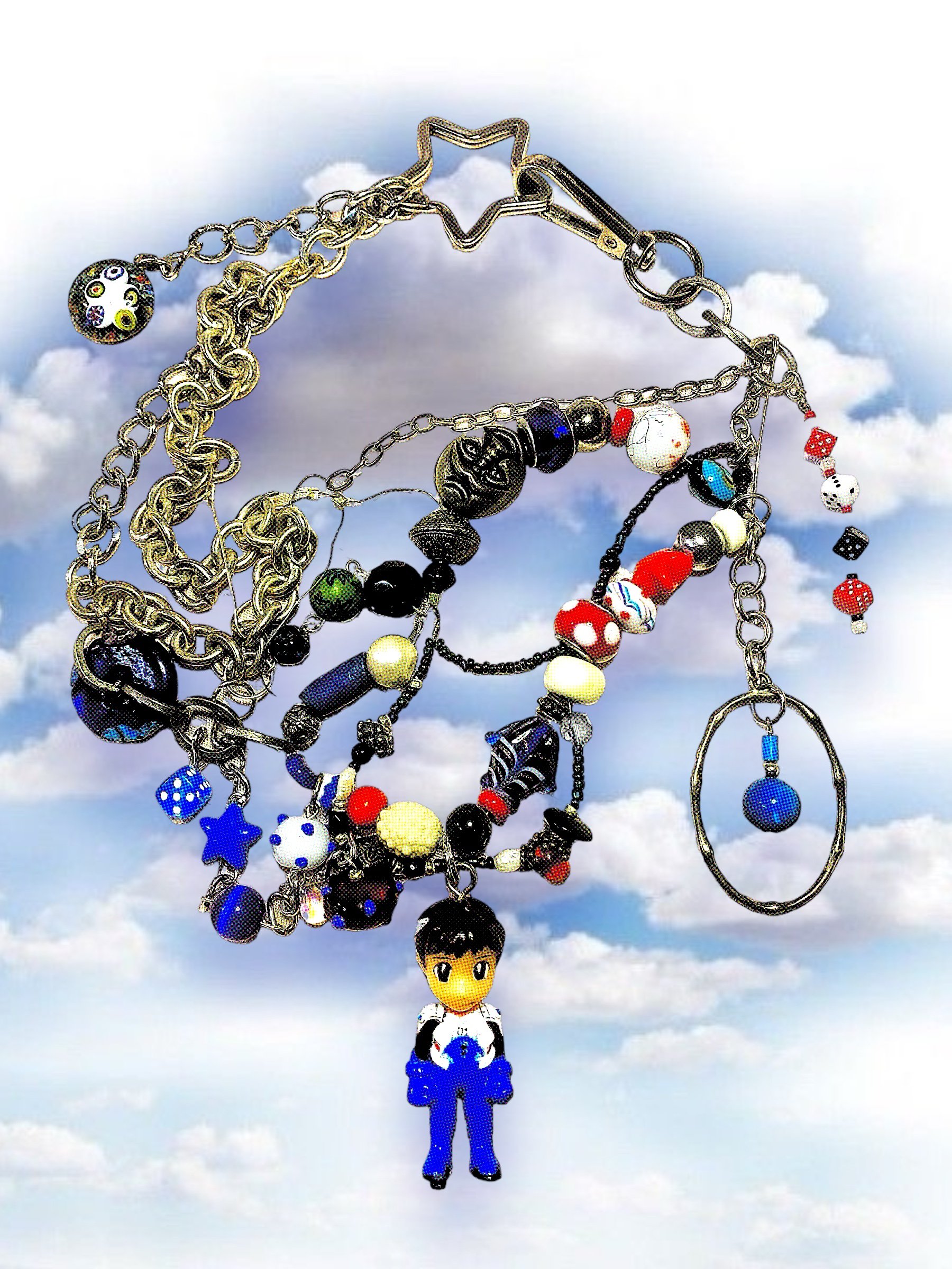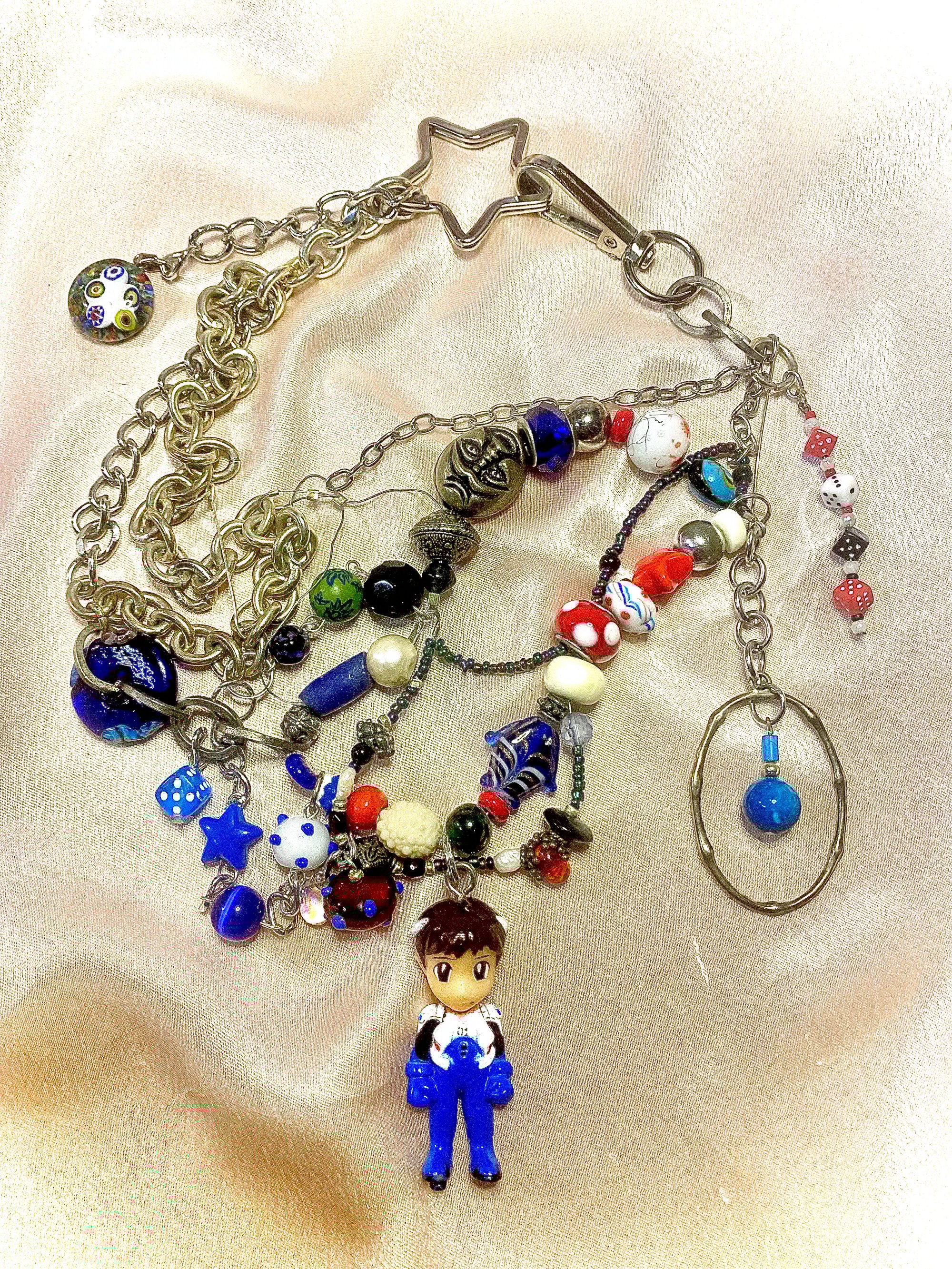 stainless steel, vintage rare Evangelion figurine, upcycled beads