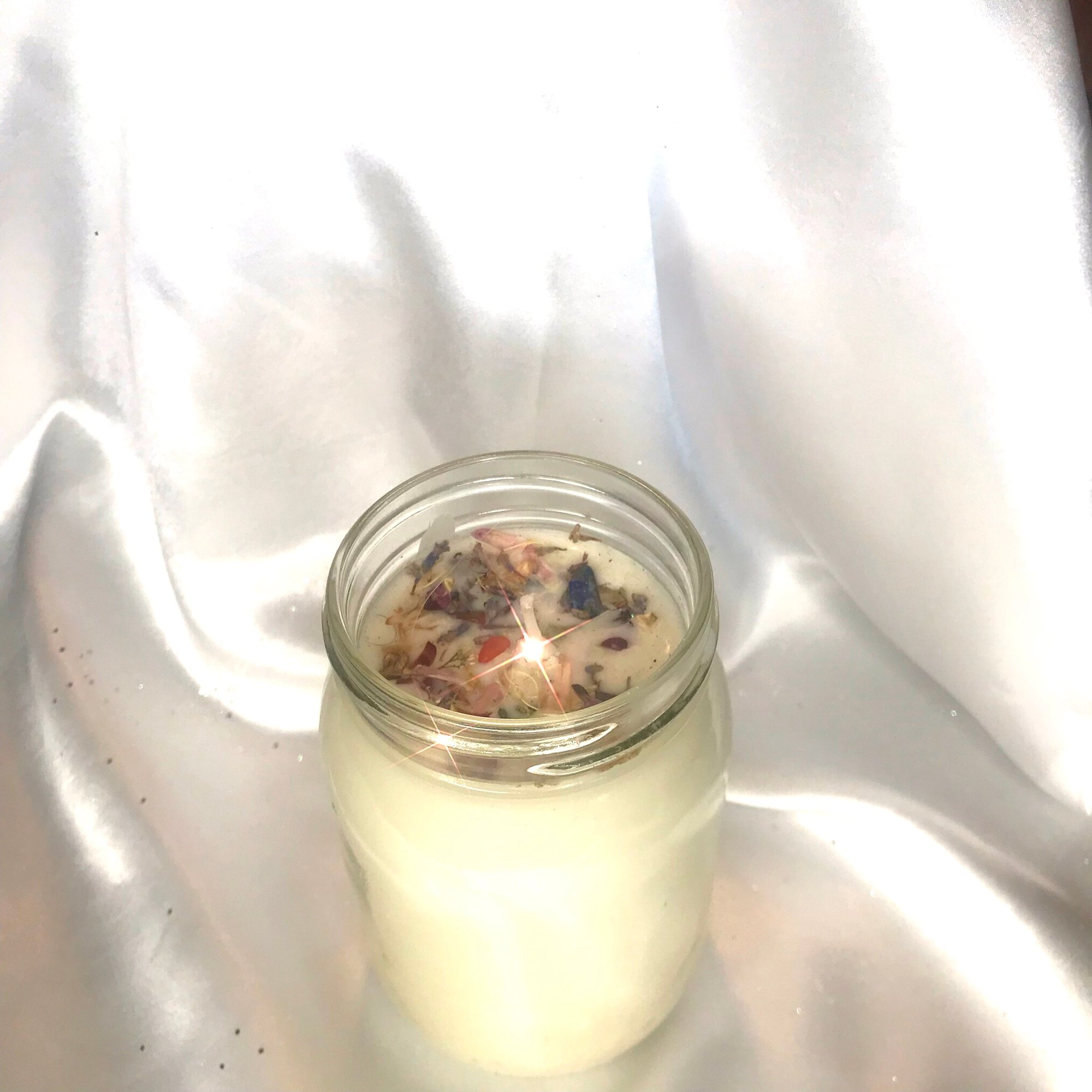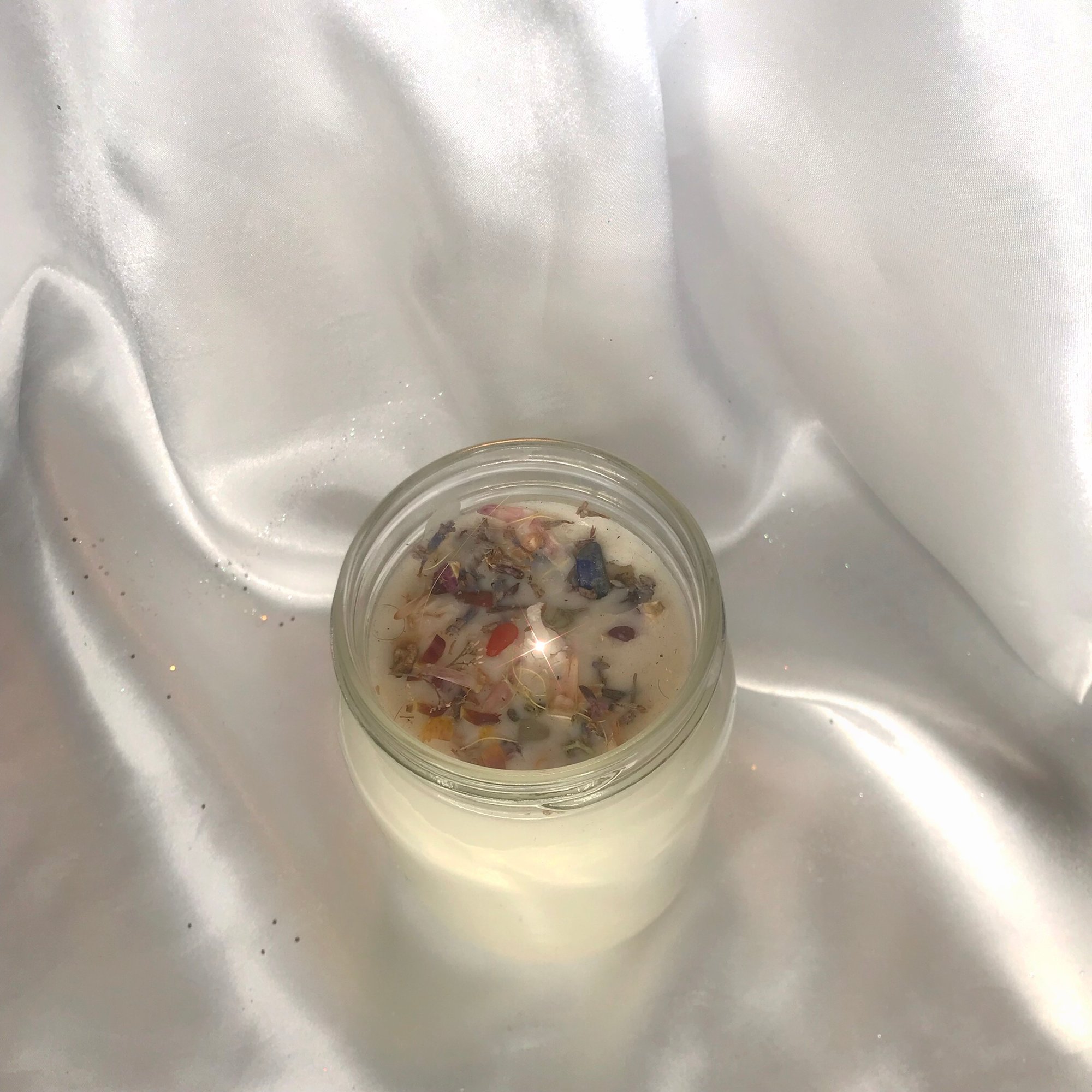-12oz hand poured soy wax candle topped w/ crystals, herbz, & flowers<33 Jar is painted with acrylic pour, glitter, & sequinz